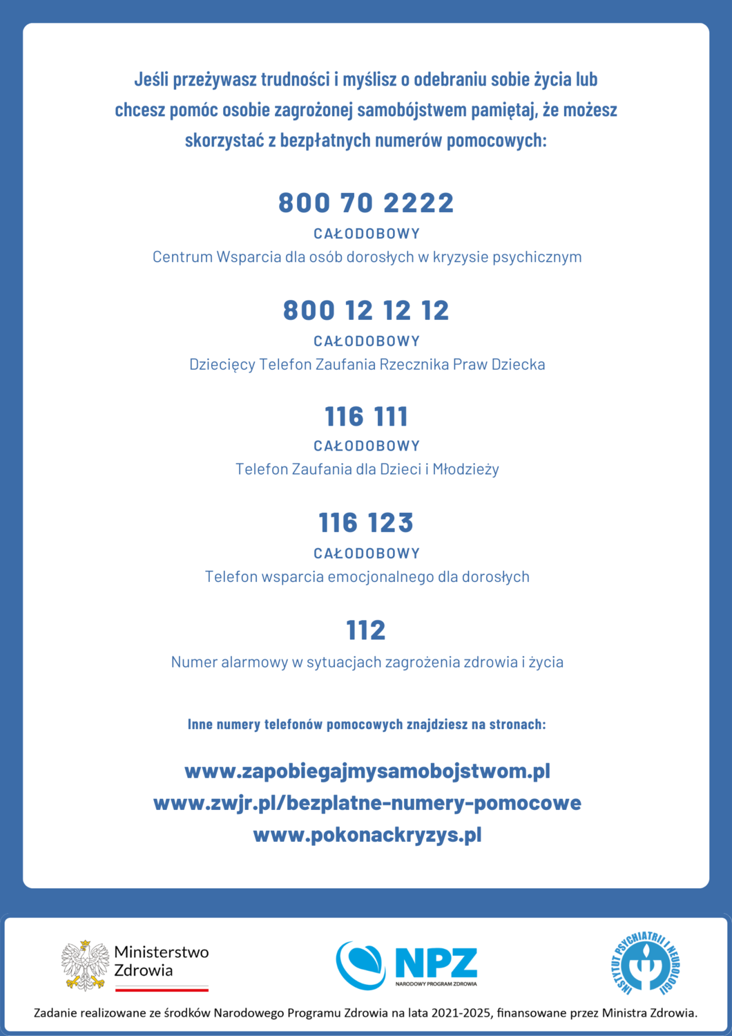 Policjanci przypominają, że w sytuacjach kryzysowych nigdy nie jesteśmy sami. Warto szukać wsparcia i nie bać się prosić o pomoc – zarówno bliskich, jak i odpowiednich służb. Jeśli zauważysz, że ktoś z twojego otoczenia potrzebuje pomocy, nie zwlekaj – szybka reakcja może uratować życie.