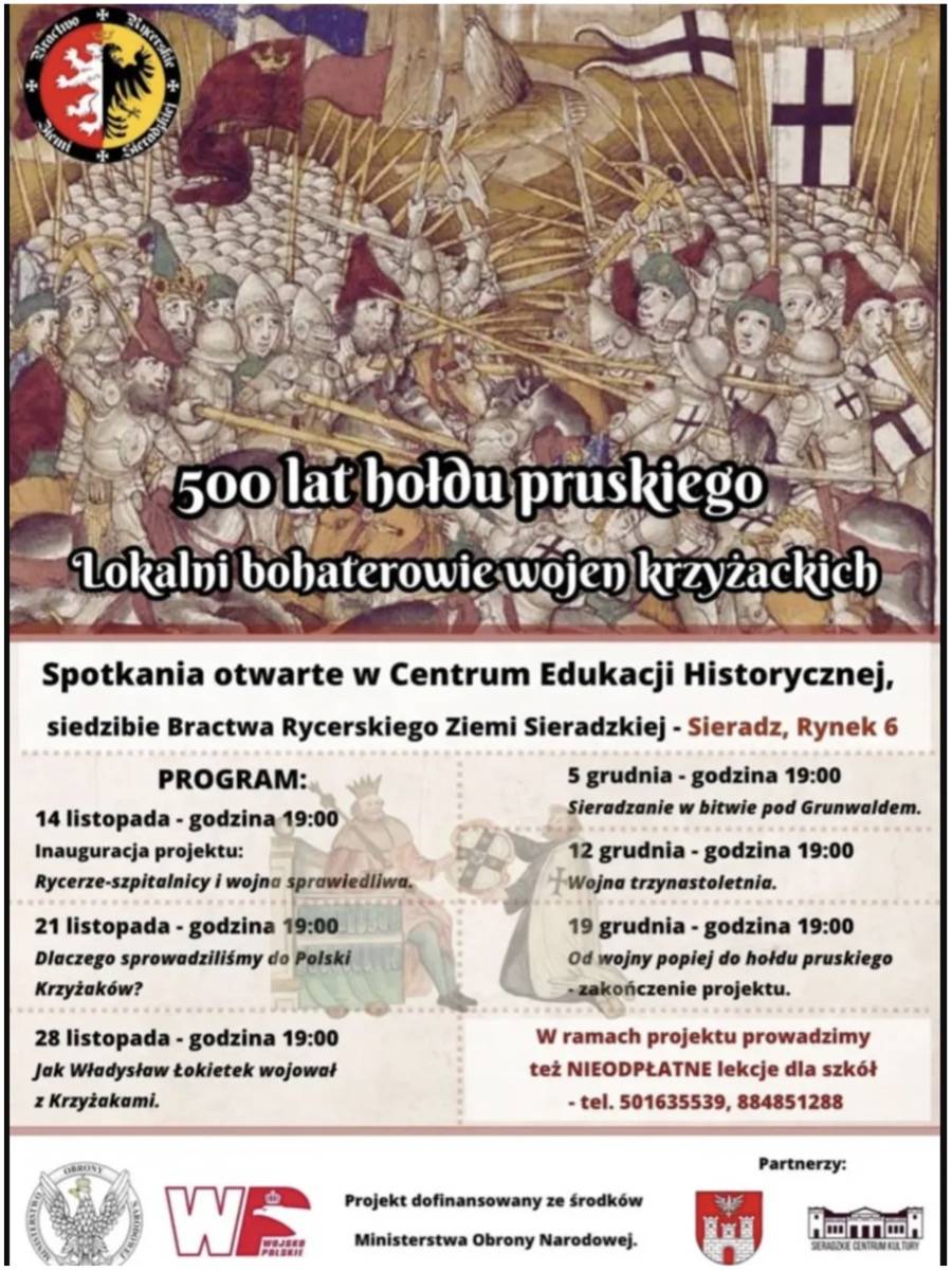 Z tej okazji Bractwo Rycerskie Ziemi Sieradzkiej realizuje cykl wydarzeń edukacyjnych pod wspólnym tytułem „500 lat hołdu pruskiego – lokalni bohaterowie wojen krzyżackich". Projekt powstał dzięki dofinansowaniu Ministerstwa Obrony Narodowej oraz wsparciu Urzędu Miasta Sieradza i Sieradzkiego Centrum Kultury.