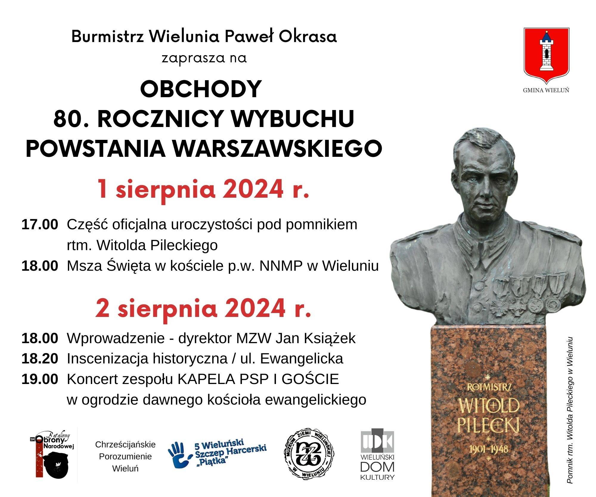 W czwartek, 1 sierpnia o godz. 17:00 odbędzie się część oficjalna pod pomnikiem rtm. Widolda Pileckiego. Godzinę później w kościele p.w. NNMP w Wieluniu odprawiona zostanie Msza Święta.
