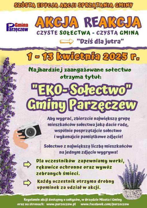 - Mieszkańcy Gminy Parzęczew – czas na wiosenne porządki w naszej okolicy! Już po raz szósty spotykamy się, by wspólnie zadbać o czystość i piękno naszej gminy. Tegoroczna edycja „Akcji Reakcji" to nie tylko sprzątanie, ale też świetna okazja do integracji, edukacji ekologicznej i realnego wpływu na środowisko!- mówią przedstawiciele UM w Parzęczewie.