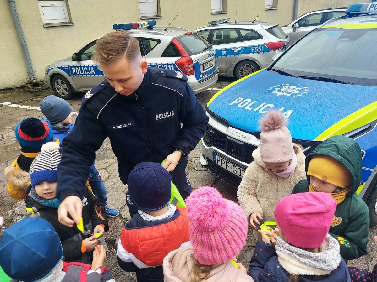 Ale przede wszystkim nie zabrakło także rozmów o bezpieczeństwie. Policjant przypominał o podstawowych zasadach podczas poruszania się po drodze, zwrócił uwagę jak ważną rolę odgrywają elementy odblaskowe. Wszyscy z dużą uwagą wysłuchali rad i wskazówek dotyczących kontaktu z osobami obcymi. Przedszkolaki nauczyły się, jak za pomocą numeru alarmowego 112 wezwać pomoc w sytuacji napotkania zagrożenia.