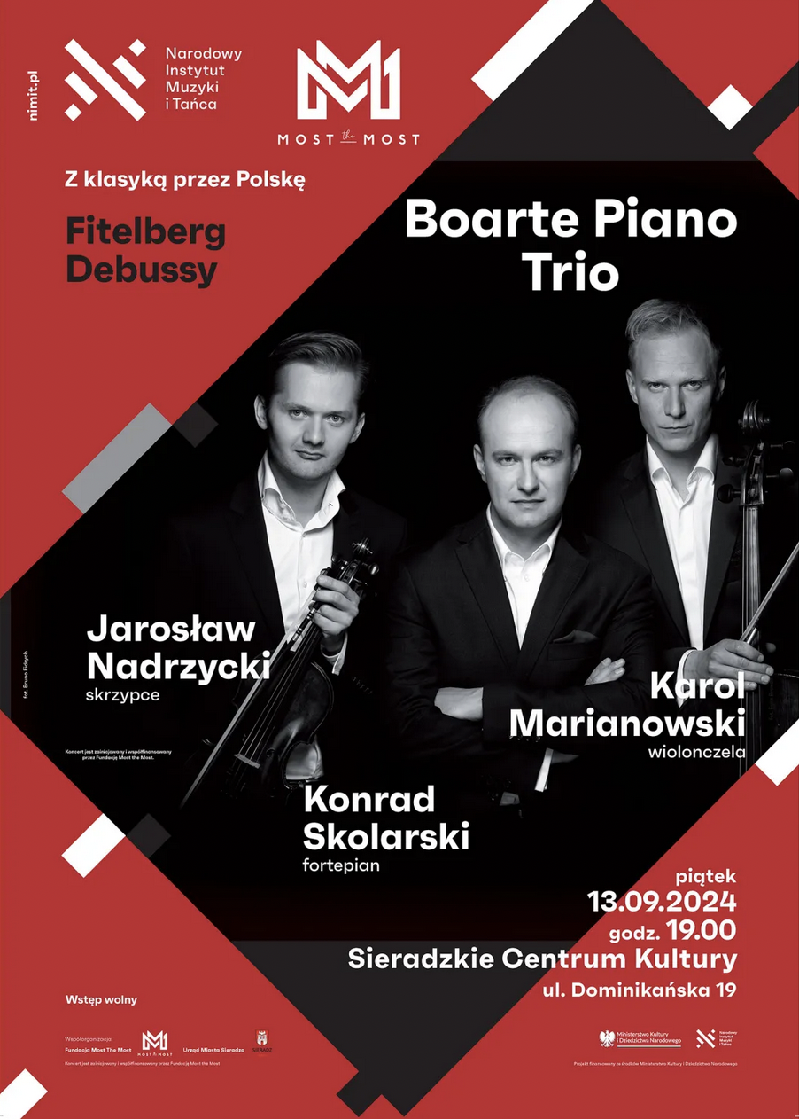 Boarte Piano Trio współtworzy trzech wybitnych polskich muzyków: Konrad Skolarski, Jarosław Nadrzycki i Karol Marianowski. Już 13 września będzie można ich posłuchać w Sieradzkim Centrum Kultury. Bezpłatne, podwójne zaproszenia można odbierać w kasie Sieradzkiego Centrum Kultury - ul. Dominikańska 19.