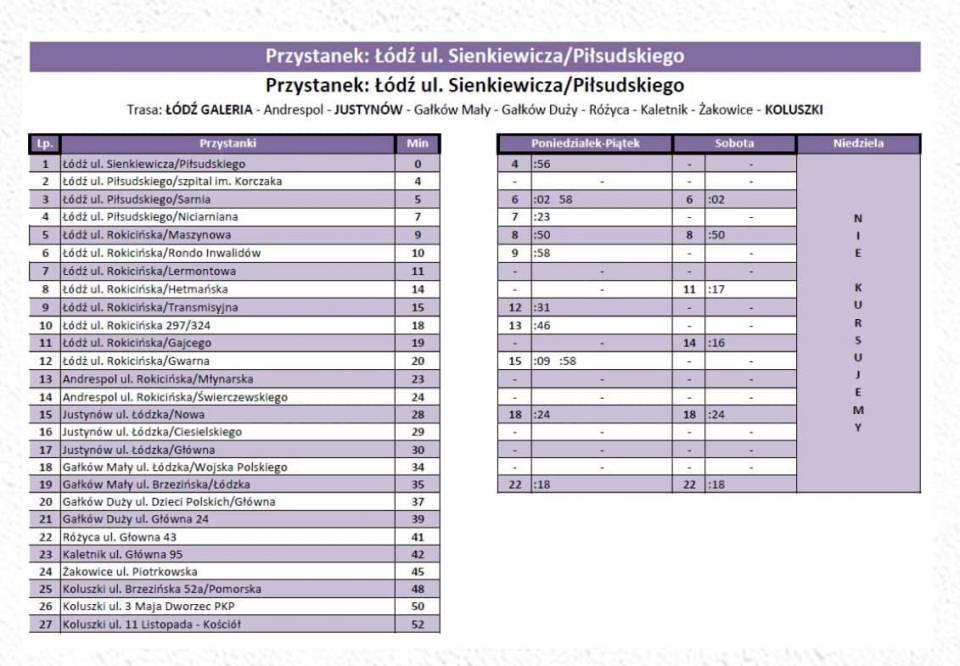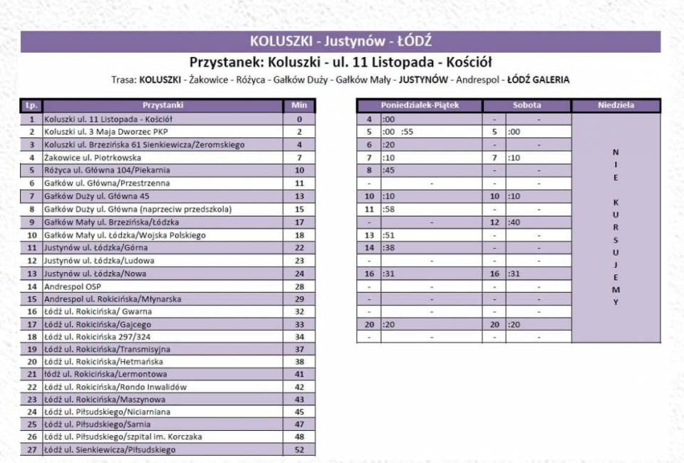 Firma Kasz - Bus poinformowała o wznowieniu połączenia bus na trasie Koluszki - Justynów - Andrespol - Łódź. Kursy rozpoczęły się dzisiaj (2 listopada).