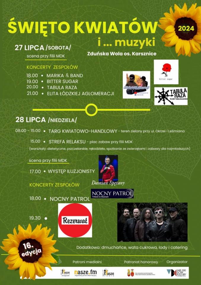 Sobota, 27 lipca i niedziela, 28 lipcaPrzez dwa dni osiedle Karsznice będzie żyło „Świętem Kwiatów 2024". Na sobotę zaplanowano wieczorne koncerty, a w niedzielę część wystawową oraz popołudniowe występy. Wydarzenie odbędzie się pod Honorowym Patronatem Prezydenta Miasta Zduńska Wola.