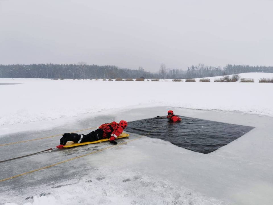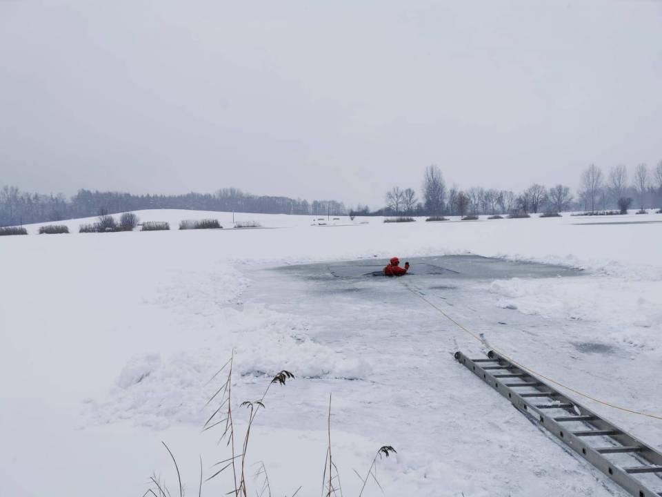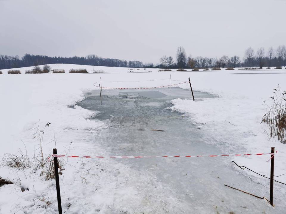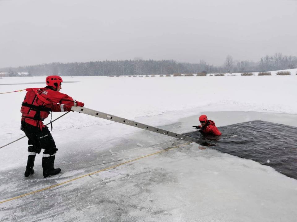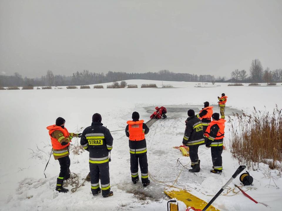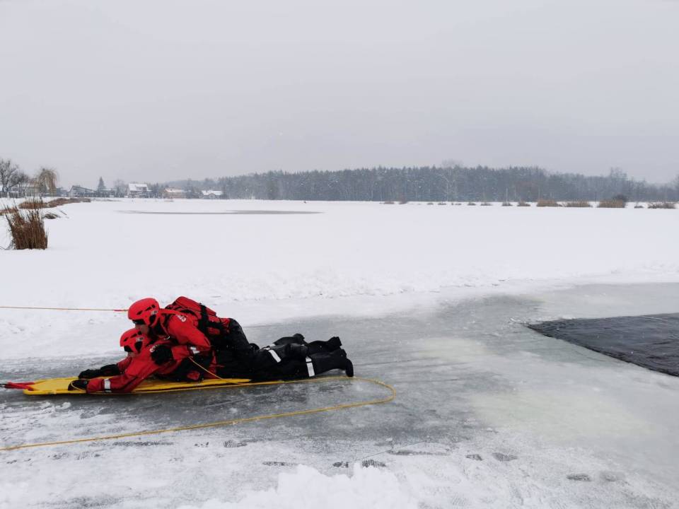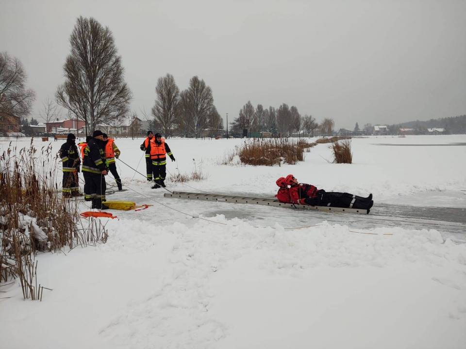 - Pod żadnym pozorem nie należy wchodzić na lód, jeżeli nie mamy pewności, że jesteśmy bezpieczni - mówi kpt. Łukasz Aleksandrowicz. - Dziś lód na zbiorniku ma około 5 cm grubości i nie jest wystarczająco gruby, aby można na niego bezpiecznie wchodzić. Miejsce, w którym ćwiczyliśmy jest zabezpieczone taśmą ostrzegawczą.