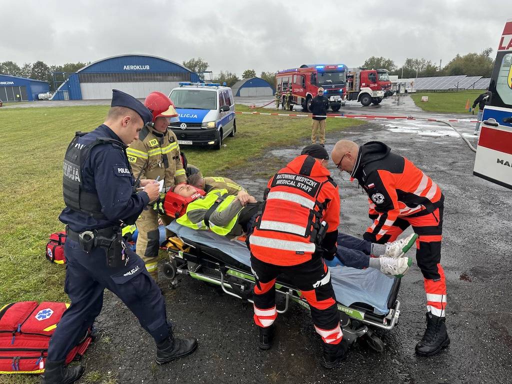 Na sygnał alarmowy natychmiast zareagowały służby. Strażacy błyskawicznie zabezpieczyli miejsce pozorowanej katastrofy, wykorzystując pianę gaśniczą, a następnie wydobyli nieprzytomną załogę samolotu. Równolegle zespoły ratownictwa medycznego udzieliły pierwszej pomocy i przetransportowały „poszkodowanych" do szpitala. Teren lotniska został zabezpieczony przez policję, a operacje lotnicze wstrzymano na czas akcji ratowniczej, zgodnie z wydanym NOTAM-em – oficjalnym ostrzeżeniem dla ruchu lotniczego.