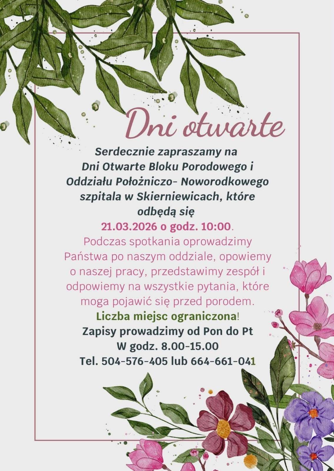 Zapisy na Dzień Otwarty prowadzone są od poniedziałku do piątku w godzinach od 8.00 do 15.00 pod numerami telefonów 504 576 405 oraz 664 661 041. Nie warto zwlekać z zapisem, ponieważ liczba miejsc jest ograniczona.