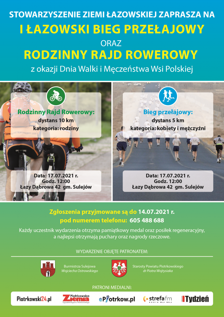 Z okazji Dnia Walki i Męczeństwa Wsi Polskiej Stowarzyszenie Ziemi Łazowskiej zaprasza w najbliższą sobotę 17 lipca na I Łazowski Bieg Przełajowy i Rodzinny Rajd Rowerowy. Zapisy dla chętnych, pod numerem telefonu 605-488-688, prowadzone będą do 14 lipca. Patronat nad wydarzeniem, które odbędzie się w Łazach Dąbrowie objął Starosta Piotr Wojtysiak.
