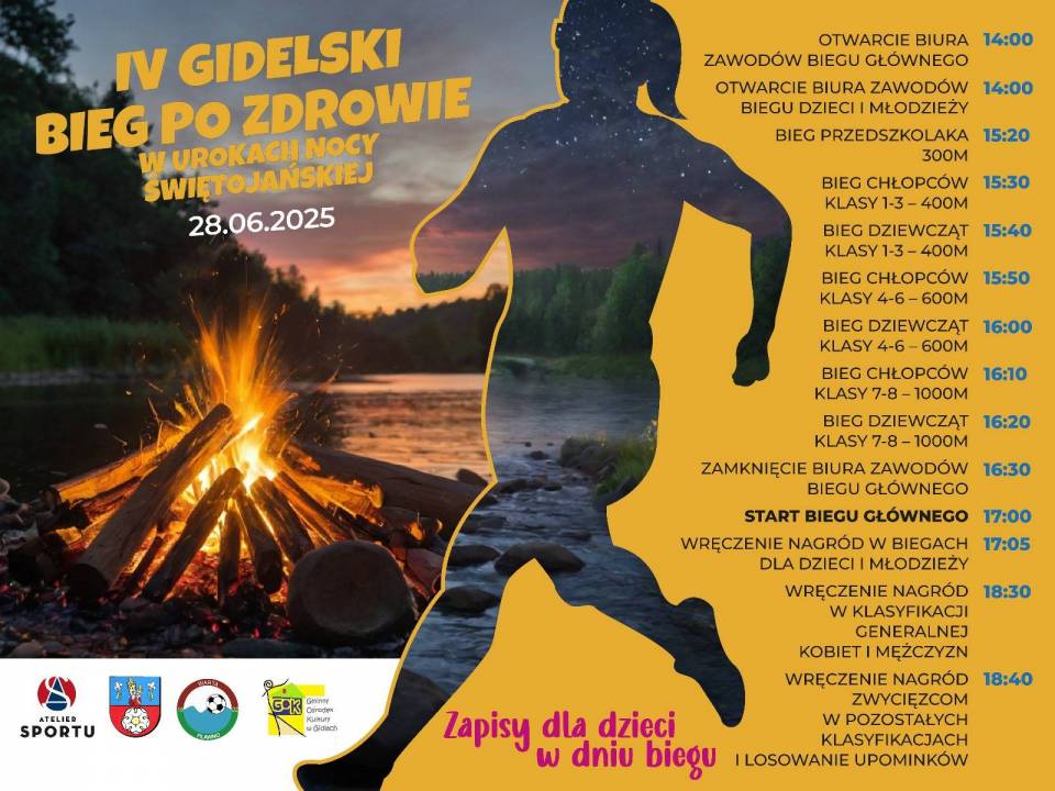 Już po raz czwarty Gmina Gidle oraz Stowarzyszenie Atelier Sportu zapraszają mieszkańców i miłośników aktywnego stylu życia na wyjątkowe wydarzenie łączące sport, edukację zdrowotną i świętowanie lokalnych tradycji – Gidelski Bieg po Zdrowie w Urokach Nocy Świętojańskiej. Impreza odbędzie się 28 czerwca 2025 roku na boisku sportowym przy ul. Częstochowskiej w Pławnie. W organizację biegu zaangażowani są także LKS WARTA Pławno oraz Gminny Ośrodek Kultury w Gidlach. Jest jeszcze ostatnia szansa na start – zostały bowiem wolne miejsca!