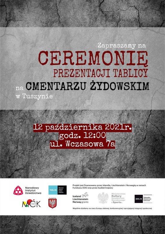 Urząd Miasta w Tuszynie zaprasza na uroczystość prezentacji tablicy na Cmentarzu Żydowskim w Tuszynie, przy ulicy Wczasowej 7A, która odbędzie się we wtorek, 12 października o godzinie 12.00.