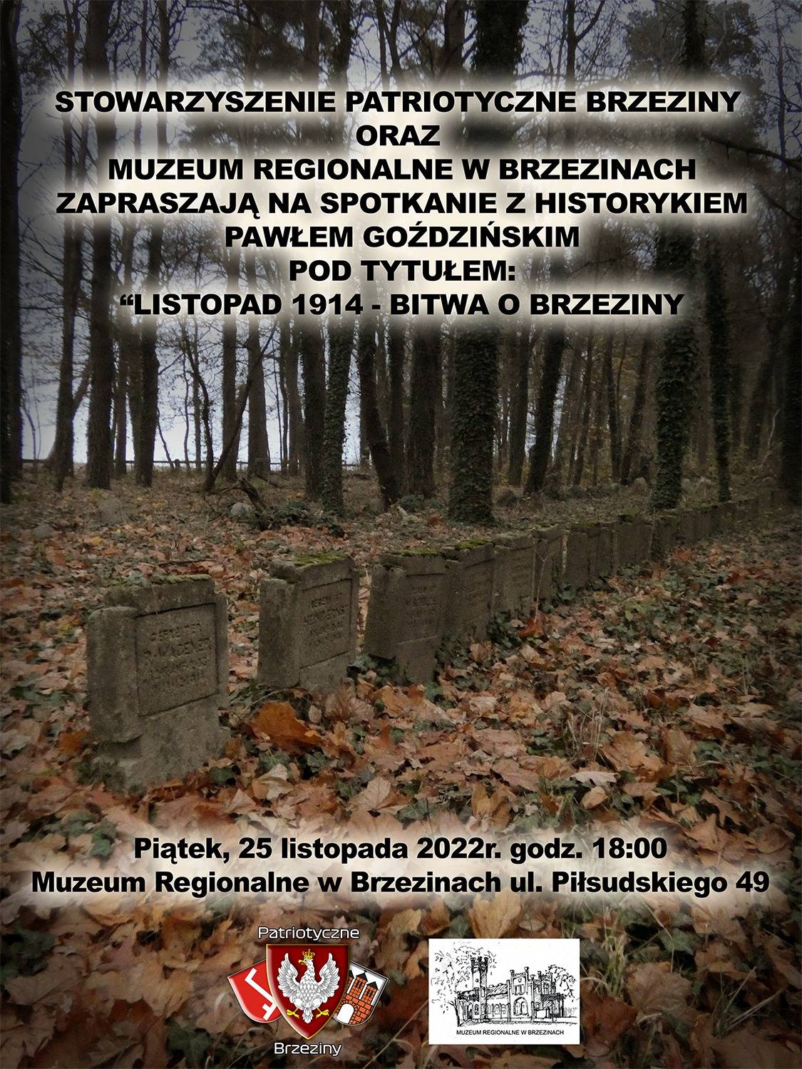 - Był czas kiedy w listopadzie 1914 roku nazwa Brzeziny gościła na pierwszych stronach najpoczytniejszych gazet wydawanych w państwach europejskich zaangażowanych w I wojnę światową. W tamtym czasie na Ziemi Brzezińskiej w ramach Operacji Łódzkiej, największej bitwy manewrowej frontu wschodniego Wielkiej Wojny, toczyły się niezwykle krwawe i zacięte walki pomiędzy armią niemiecką a rosyjską, których częścią było słynne „przełamanie pod Brzezinami". Dramatyczne zwroty akcji, Brzeziny kilka razy przechodzące z rąk do rąk, śmierć setek tysięcy żołnierzy w tym wielu Polaków wcielonych do zaborczych armii - o tym i wielu innych aspektach listopada 1914 roku na Ziemi Brzezińskiej opowie z pasją, ogromną erudycją i znajomością zagadnienia przy wykorzystaniu rosyjskich map sztabowych Paweł Goździński, człowiek który o dziejach naszych okolic ostatnich dwustu lat wie niemal wszystko - czytamy na stronach Muzeum Regionalnego w Brzezinach.