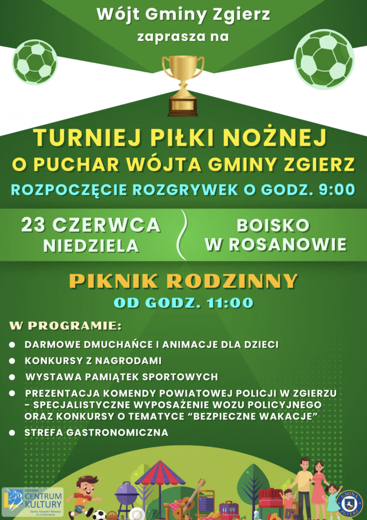 Urząd Gminy Zgierz zaprasza na Turniej Piłki Nożnej o Puchar Wójta Gminy Zgierz oraz Piknik Rodzinny. Wydarzenie odbędzie się w najbliższą niedzielę (23 czerwca).