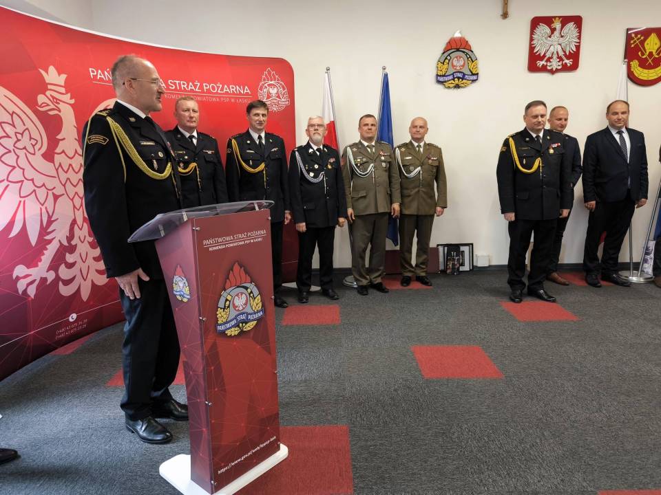 W uroczystości, która odbyła się w siedzibie Komendy Powiatowej PSP w Łasku, wzięli udział m.in.: Piotr Wołosz - Starosta Łaski, dh Wojciech Pokora, wiceprezes Oddziału Wojewódzkiego ZOSP RP woj. łódzkiego, wójtowie gmin powiatu łaskiego, przedstawiciele zaprzyjaźnionych służb Wojska Polskiego, Policji, Żandarmerii, Nadleśnictwa Komendanci Powiatowi PSP z Sieradza i Pabianic KP PSP w Łasku.