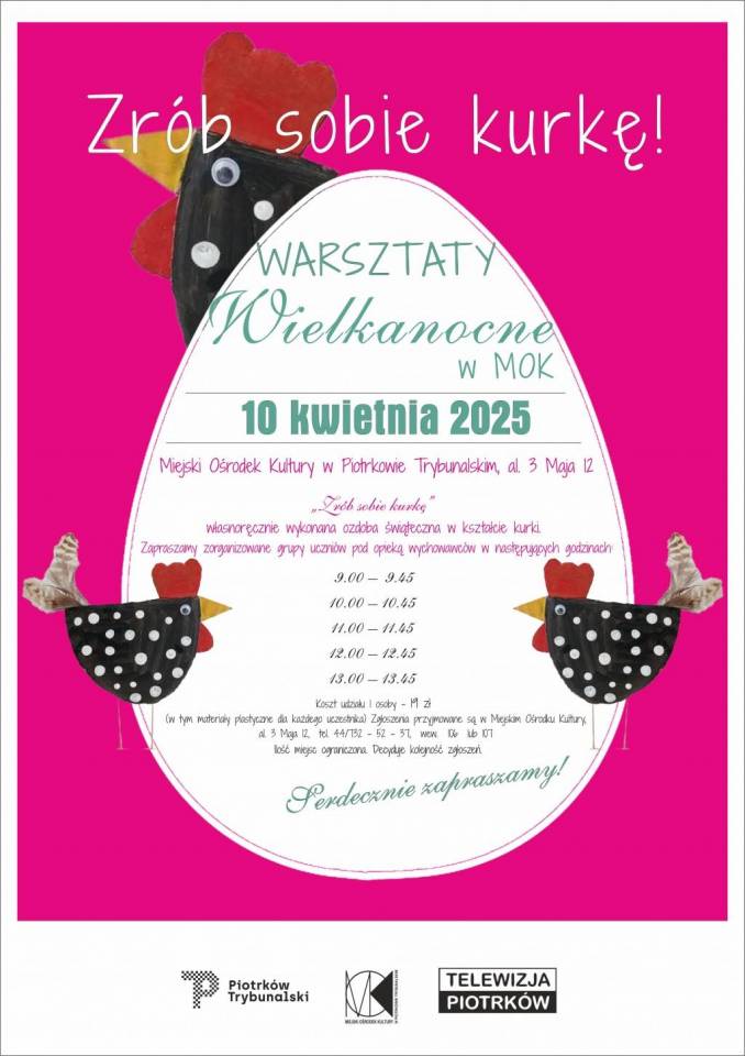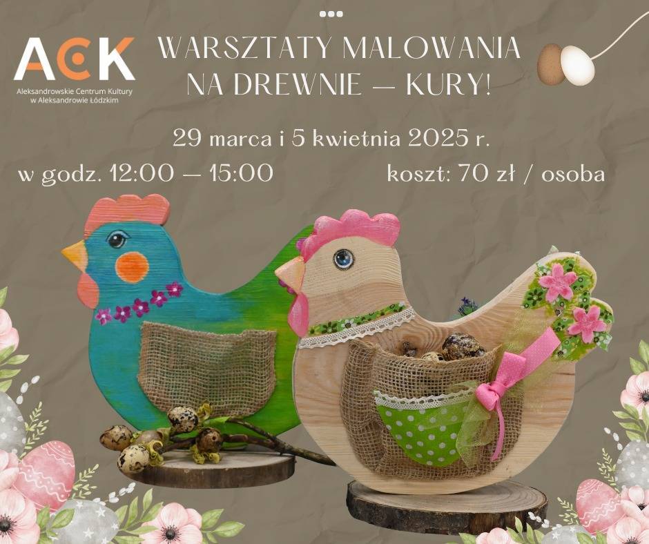 Kreatywna sobota szykuje się również w gminie Aleksandrów. 29 marca, a także 5 kwietnia odbędą się tutaj warsztaty „Malowanie na drewnie – kury". Każdy uczestnik, pod opieką instruktora nauczy się techniki malowania na drewnie, a efektem będą wyjątkowe ozdoby. W zajęciach mogą wziąć udział młodzież, dorośli i dzieci powyżej 8 roku życia.