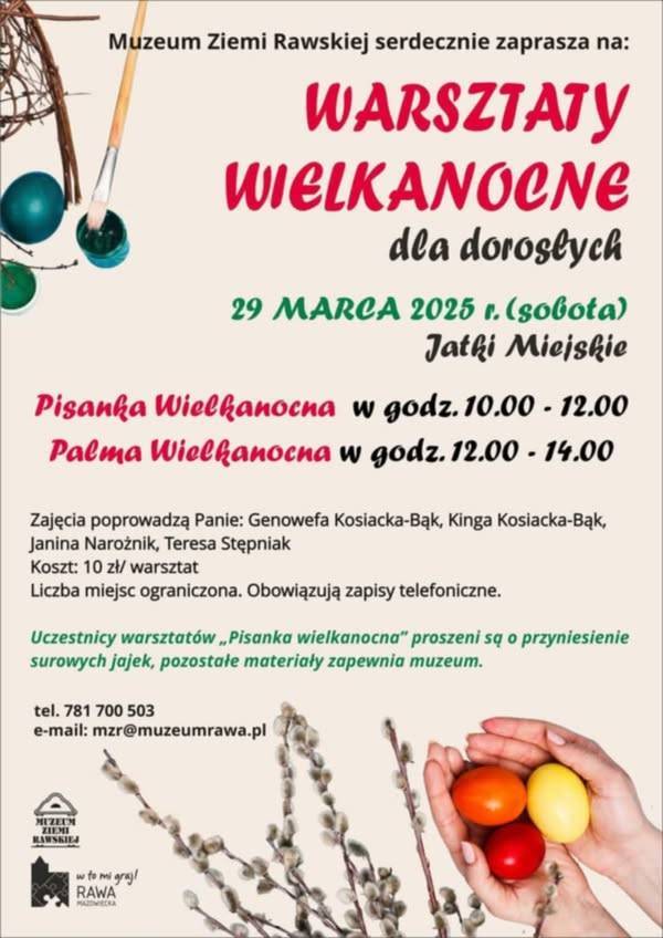 Genowefa Kosiacka-Bąk, Kinga Kosiacka-Bąk, Janina Narożnik i Teresa Stępniak – znane twórczynie ludowe z Rawy Mazowieckiej będą pokazywać, jak zgodnie ze sztuką i tradycją wykonać pisanki i palmy wielkanocne. Warsztaty odbędą się 29 marca w Jatkach Miejskich w dwóch turach.