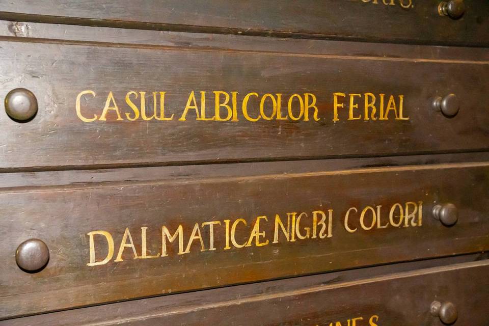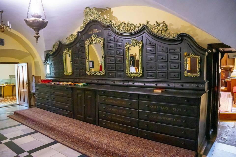 W zakrystii zachowały się cenne elementy dawnego wyposażenia: rokokowe szafy oraz komoda z XVIII wieku – świadectwo kunsztu dawnych rzemieślników.