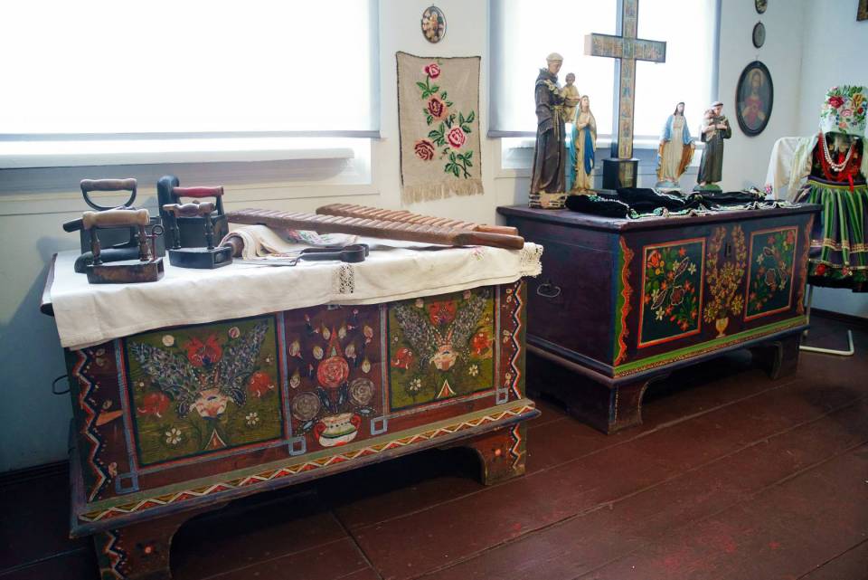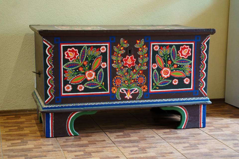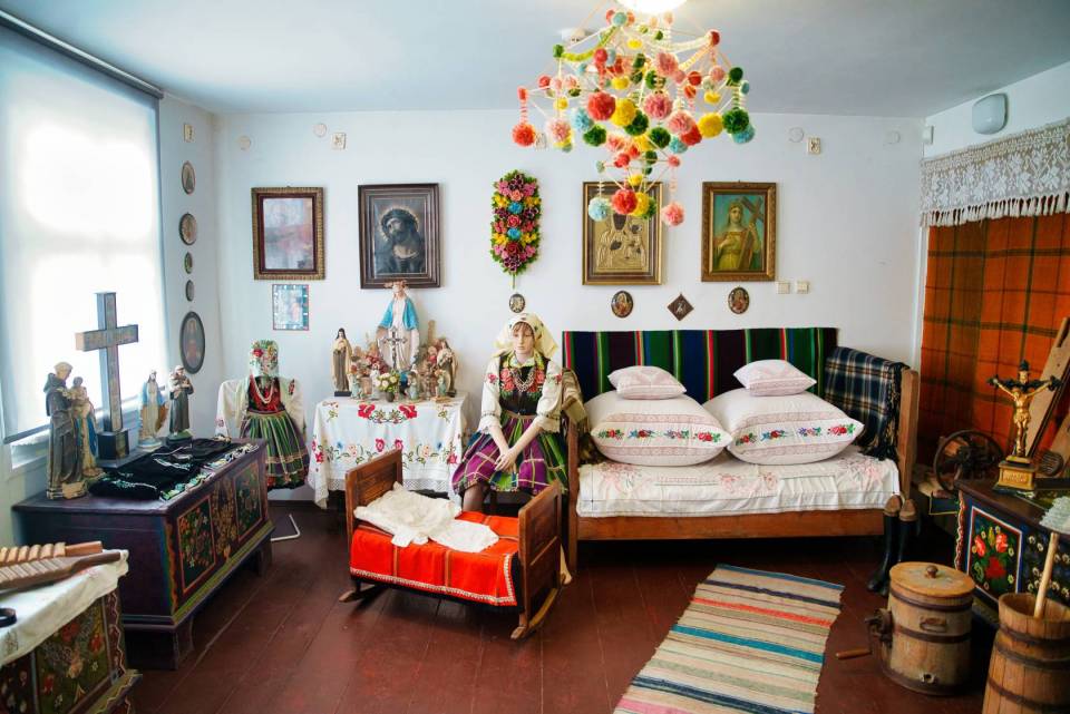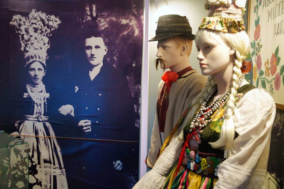 Muzeum prezentuje również bogaty zbiór eksponatów związanych z kulturą ludową, w tym tradycyjne stroje noszone przez mieszkańców Lipiec oraz charakterystyczne dla regionu tkaniny i hafty. Szczególną wartość mają zachowane stroje odświętne z początku XX wieku, a także unikatowy wieniec ślubny z 1924 roku. W izbie chłopskiej można zobaczyć oryginalne meble i wyposażenie wnętrz – drewniane łóżka, rzeźbione skrzynie na ubrania, stół z ławami oraz tradycyjną zastawę stołową. Życie codzienne dawnych mieszkańców Lipiec odzwierciedlają również narzędzia rolnicze, takie jak drewniane pługi, sierpy, cepy do młócenia zboża czy cebrzyki do prania.