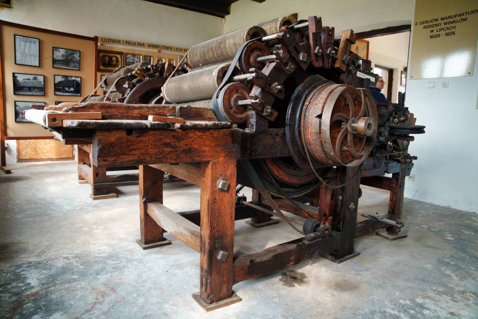 - Założycielem manufaktury był Ludwik Winkiel, przędzalnik z doświadczeniem zdobytym w zakładach w Łodzi i Brzezinach. W 1889 roku w Lipcach uruchomił zgrzeblarnię i przędzalnię wełny. Syn Ludwika, Jan Winkiel, po powrocie z wojska w 1920 roku, zaangażował się w działalność ojca, jednocześnie ucząc się farbiarstwa m.in. w Skierniewicach. W 1928 roku przeniósł zakład do nowego budynku, rozszerzając działalność o dziewiarnię i tkalnię. W dziewiarni produkowano m.in. swetry, pończochy, skarpety i rękawiczki, natomiast w tkalni powstawały materiały na łowickie pasiaki, kilimy, narzuty, chodniki oraz krajki harcerskie – mówi dyrektor Kalisiak.
