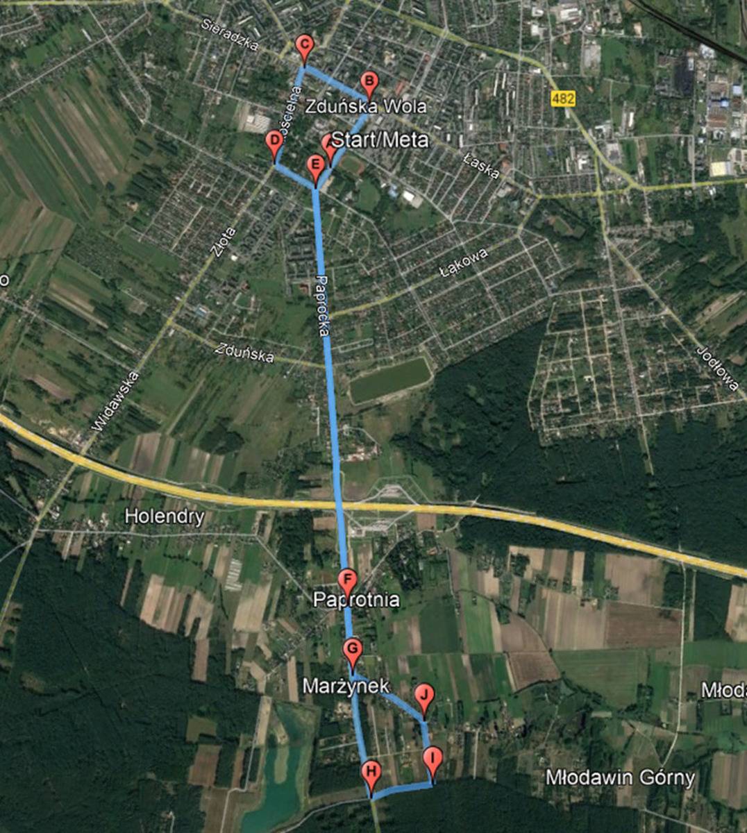 Start i meta wyścigu zostały zaplanowane przed stadionem Powiatowego Międzyszkolnego Ośrodka Sportowego przy ulicy Piwnej. Trasa prowadzi przez ulice: Piwną, Łaską, Kościelną, Dolną, Paprocką do wsi Marżynek, gdzie kolarze pojadą ulicami Pod Borem oraz Spacerową i wrócą ulicą Paprocką do Zduńskiej Woli.