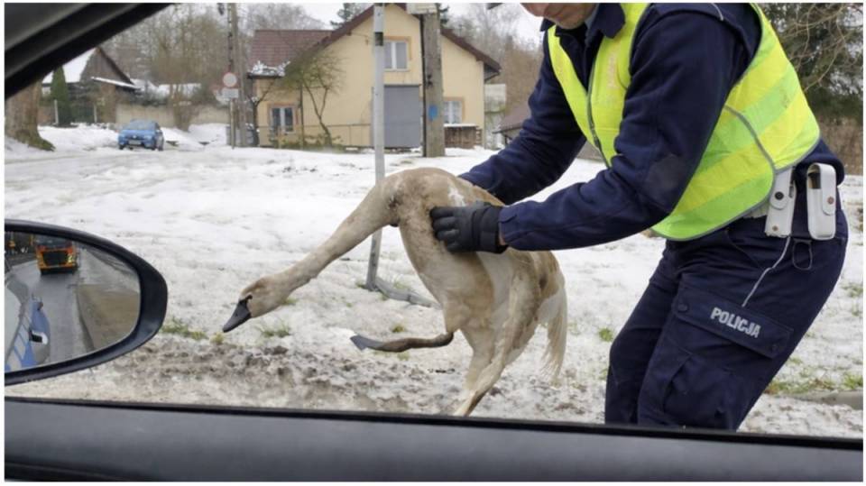 Szybka reakcja policjantów tomaszowskiej drogówki pozwoliła uratować młodego łabędzia, który 10 lutego 2026 roku zakleszczył się w konstrukcji mostu na drodze krajowej numer 48 w Inowłodzu.