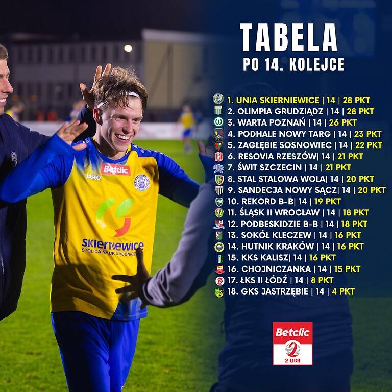 Za plecami Unii znajduje się Olimpia Grudziądz (również 28 punktów), która ustępuje skierniewiczanom jedynie bilansem bramek. Podium uzupełnia Warta Poznań z dorobkiem 26 oczek, po weekendowym remisie w Nowym Sączu.