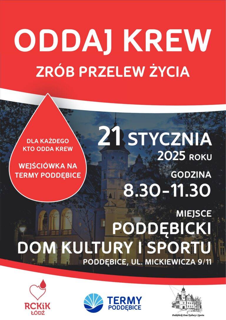 We wtorek, 21 stycznia br. w godzinach 8:30-11:30 w Poddębickim Domu Kultury i Sportu odbędzie się akcja pn. "Oddaj krew – zrób przelew życia".