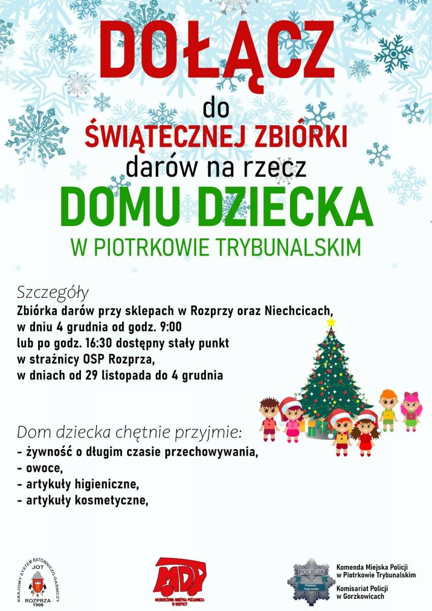 Piotrkowscy policjanci udowadniają, że maja wielkie serca! Połączone siły mundurowych z Piotrkowa Trybunalskiego, Gorzkowic, druhów z OSP oraz Młodzieżowej Drużyny Pożarniczej w Rozprzy zapraszają do wzięcia udziału w Świątecznej zbiórce dla najmłodszych, którzy są podopiecznymi Domu Małego Dziecka w Piotrkowie Trybunalskim.