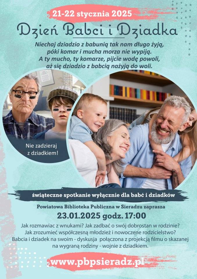 Powiatowa biblioteka Publiczna w Sieradzu zaprasza w środę 23 stycznia 2025 o godz. 17:00 na spotkanie z okazji Dnia Babci i Dziadka.