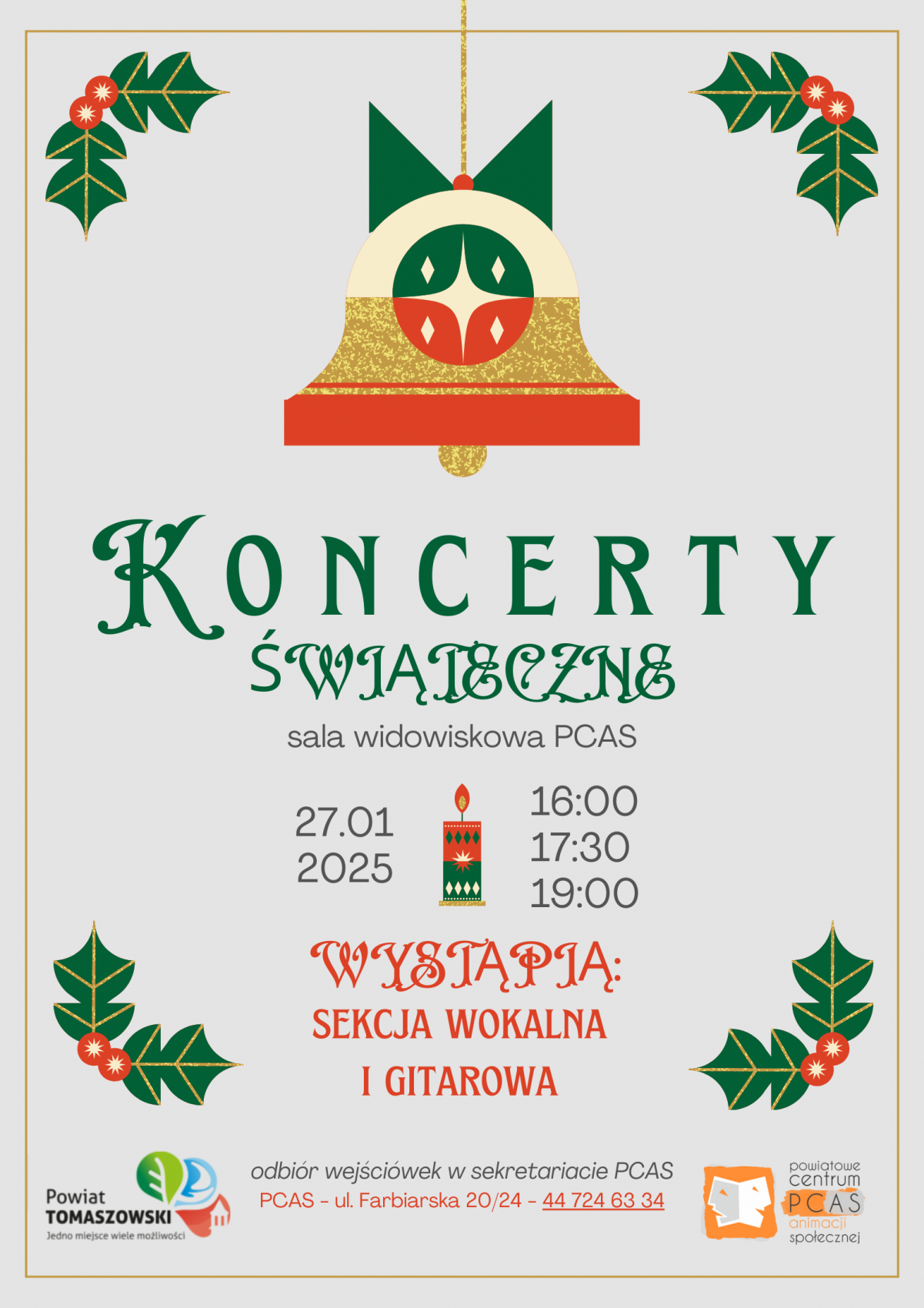 Powiatowe Centrum Animacji Społecznej organizuje Koncert Świąteczny. To propozycja dla wszystkich, którzy chcą jeszcze choć na chwilę powrócić do atmosfery świąt, wspólnego spędzenia czasu i kolędowania.
