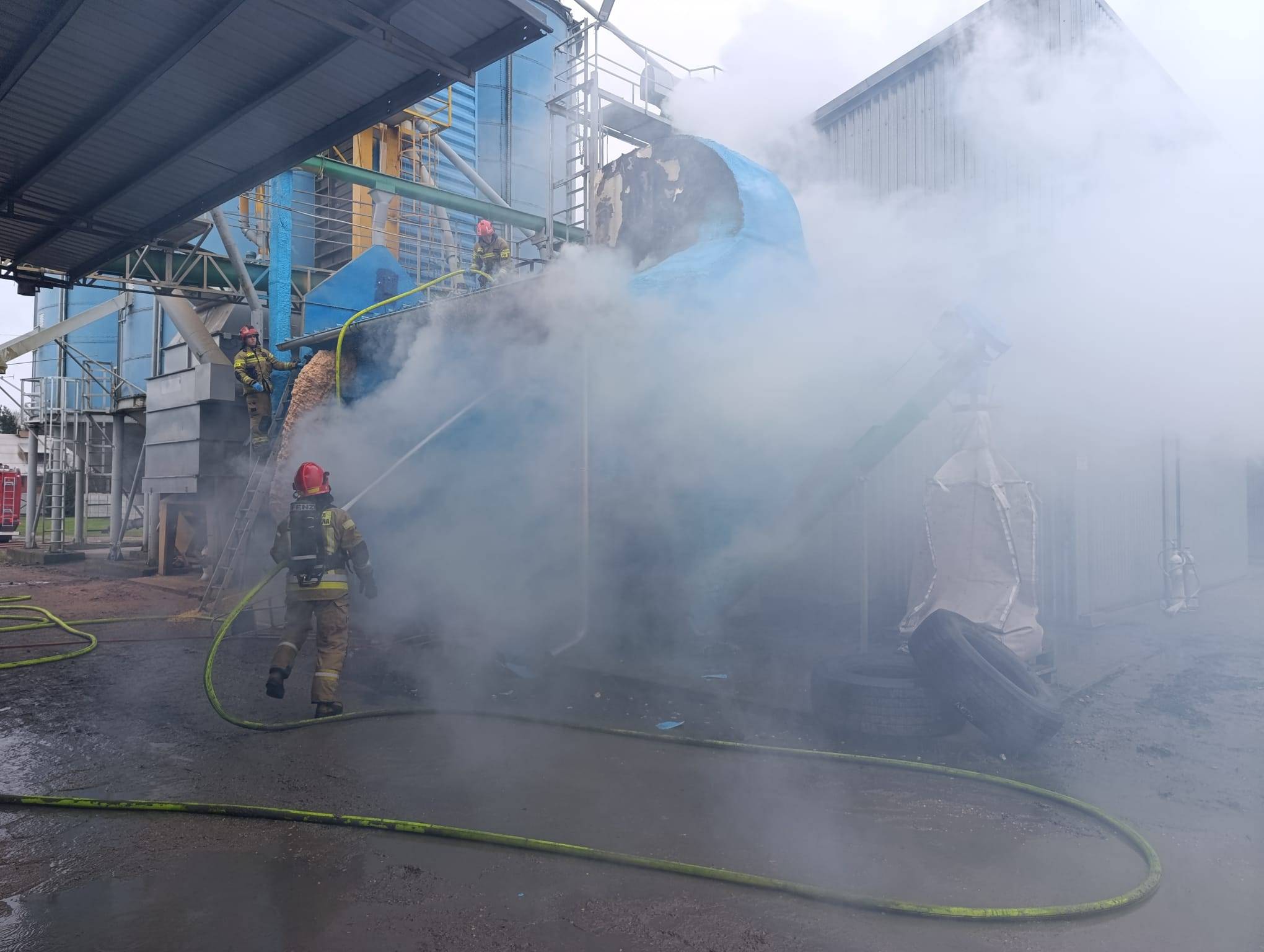 Na miejsce natychmiast skierowano jednostki straży pożarnej. Strażacy opanowali pożar, a następnie przystąpili do częściowej rozbiórki nadpalonych elementów suszarni. Cały obiekt został dokładnie sprawdzony kamerą termowizyjną pod kątem występowania podwyższonych temperatur wewnątrz urządzeń.