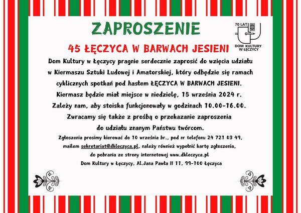 Dom Kultury w Łęczycy zaprasza do wzięcia udziału w kiermaszu sztuki ludowej i amatorskiej, który odbędzie się w ramach cyklicznych spotkań pod hasłem "Łęczyca w Barwach Jesieni".