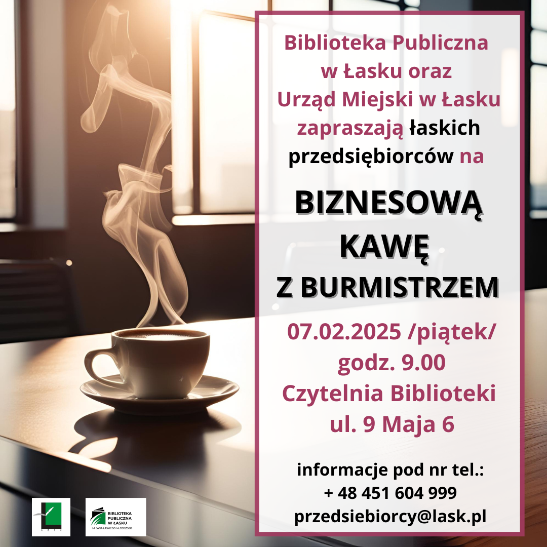 Biblioteka Publiczna w Łasku oraz Urząd Miejski w Łasku zapraszają łaskich przedsiębiorców na Biznesową Kawę z Burmistrzem Łasku Moniką Mrowińską. Do wspólnego stołu w bibliotecznej czytelni będzie można zasiąść już w najbliższy piątek, 7 lutego. Początek o godzinie 9.00 w.