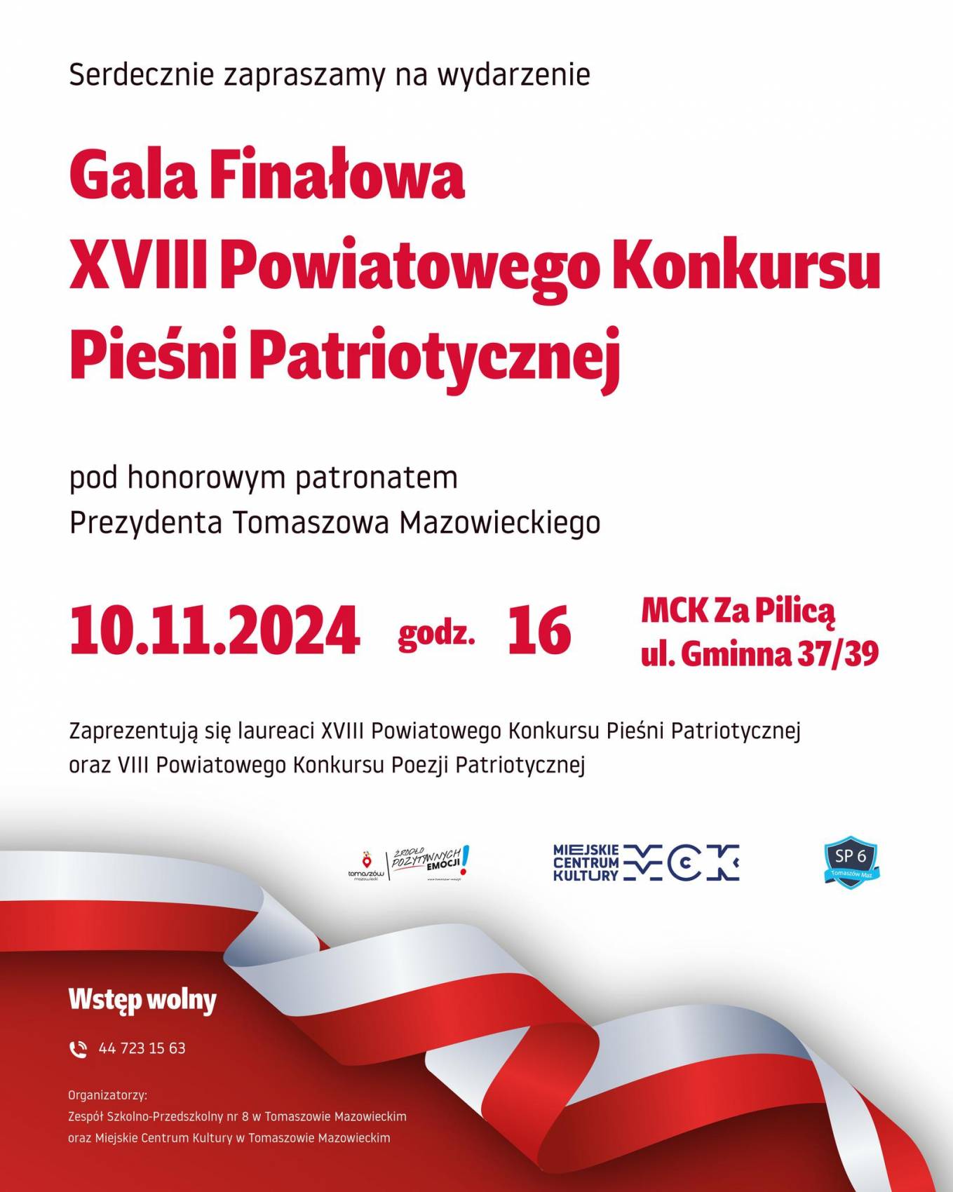Już dziś, 6.11 oraz we czwartek, 7.11 w Miejskim Centrum Kultury Za Pilicą (ul. Gminna 37/39) rozpoczyna się Powiatowy Konkurs Pieśni i Poezji Patriotycznej, którego - wraz z Zespołem Szkolno- Przedszkolnym Nr 8 w Tomaszowie Mazowieckim – MCK jest od lat współorganizatorem.