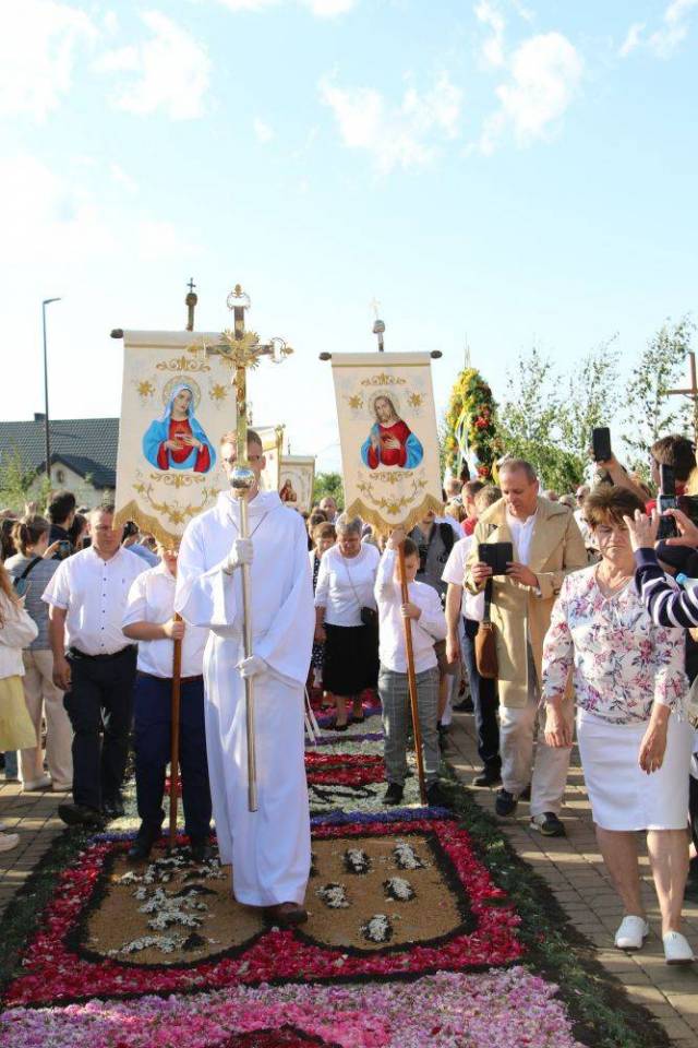Uroczystość Bożego Ciała w tej niewielkiej miejscowości rozpoczyna się jeszcze przed świtem – nie od procesji, lecz od wspólnej pracy. Dłonie dorosłych i dzieci pochylają się nad ziemią, by z płatków kwiatów stworzyć barwne wzory i religijne symbole.