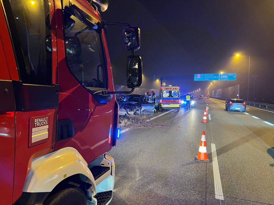 System eCall zadziałał! Kierowca osobówki uderzył w barierę na trasie S8. Służby błyskawicznie trafiły na miejsce zdarzenia [Foto]