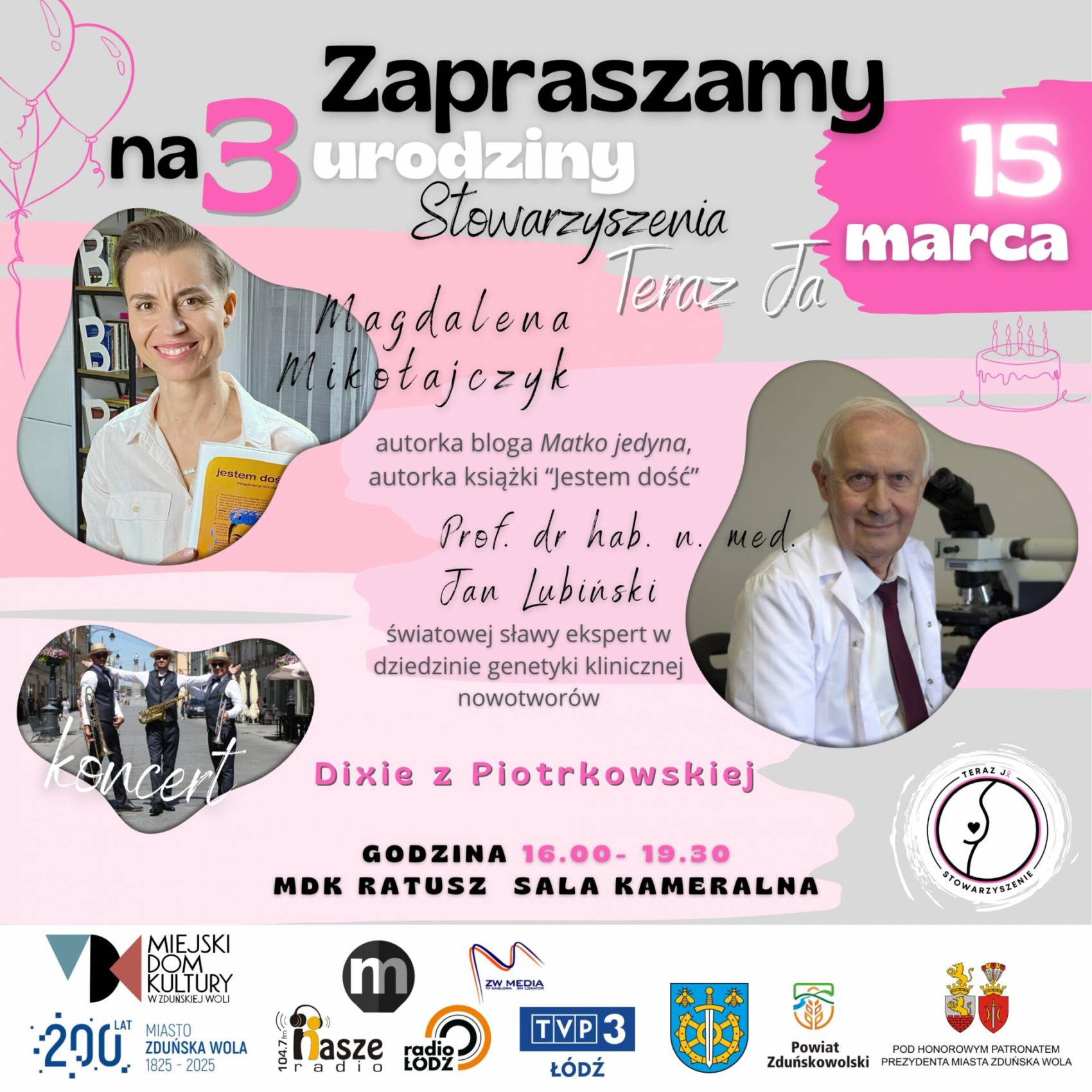 Trzecie Urodziny Stowarzyszenia „Teraz Ja" zaplanowano na 15 marca 2025 roku. Wydarzenie obędzie się w godzinach 16 -19.30 w sali kameralnej Miejskiego Domu Kultury Ratusz przy pl. Wolności w Zduńskiej Woli. Wstęp wolny.