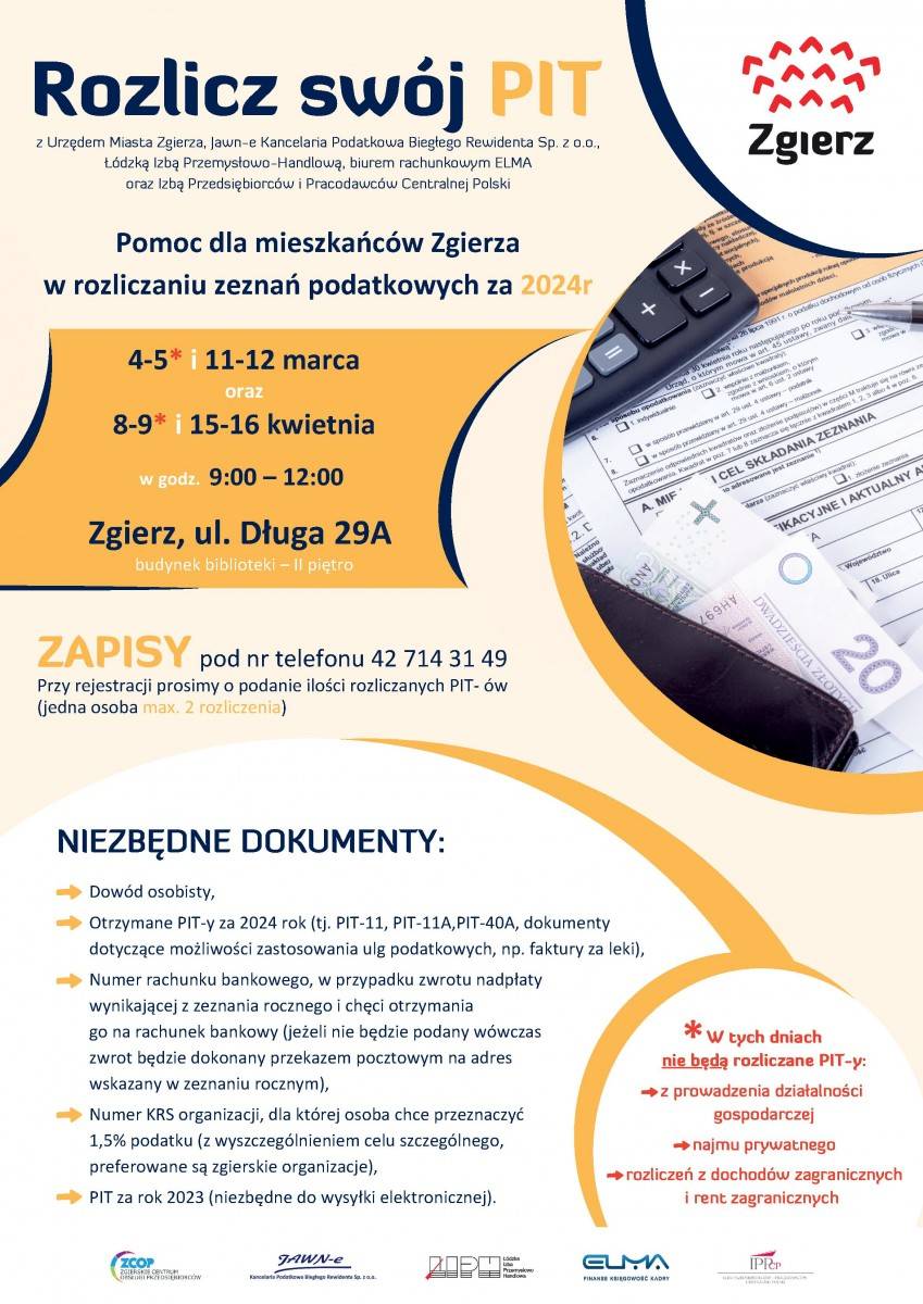 Zapisy dostępne pod nr tel. 42 714 31 49. Przy rejestracji prosimy o podanie ilości rozliczanych PIT-ów (jednak osoba max 2 rozliczenia).