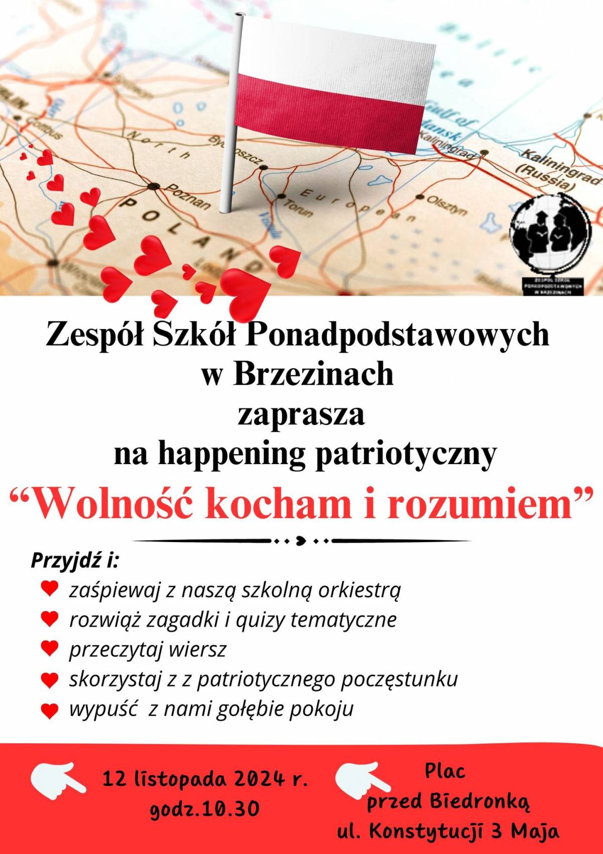 Zespół Szkół Ponadpodstawowych w Brzezinach zaprasza na happening patriotyczny, który przebiegnie pod nazwą "Wolność kocham i rozumiem".