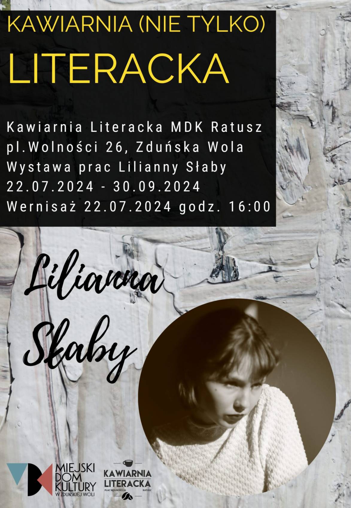 Nowa wystawa będzie pokazywana w Kawiarni Literackiej w Ratuszu od poniedziałku, 22 lipca. W cyklu Kawiarnia (Nie tylko) Literacka zaprezentowane będą prace Liliany Słaby, która jest uczennicą trzeciej klasy Państwowego Liceum Sztuk Plastycznych im. Katarzyny Kobro w Zduńskiej Woli. Wystawę oglądać będzie można do końca września.
