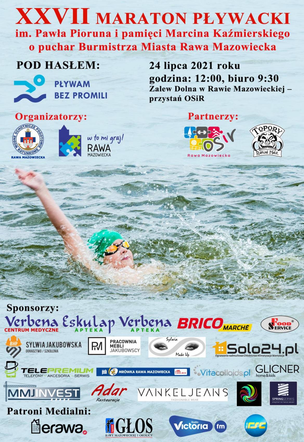 W sobotę 24 lipca odbędzie się już XXVII Maraton Pływacki im. Pawła Pioruna i pamięci Marcina Kaźmierskiego. Starty zawodników rozpoczną się o godz. 12:00. Maraton pływacki odbywa się pod honorowym patronatem burmistrza Rawy Mazowieckiej Piotra Irli.