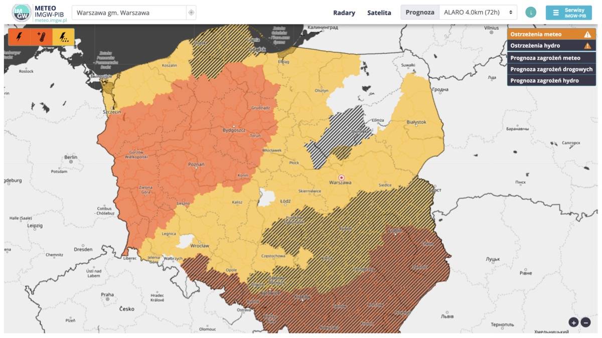 - Miejscami pojawiły się pierwsze burze, którym towarzyszą opady deszczu o natężeniu do 5 mm/10 min, dając godzinną sumę opadów rzędu około 10 mm. W ciągu kolejnych 2-3 godzin godzin przewiduje się dalszy rozwój burz z intensywniejszymi zjawiskami towarzyszącymi: wysokość opadów do 15-20 mm, porywy wiatru do 65 km/h, choć punktowo niewykluczone są wyższe prędkości, lokalnie grad do 2 cm. Burze przemieszczać się będą z południowego-zachodu/zachodu na północny-wschód/wschód - przekazują synoptycy z IMGW.