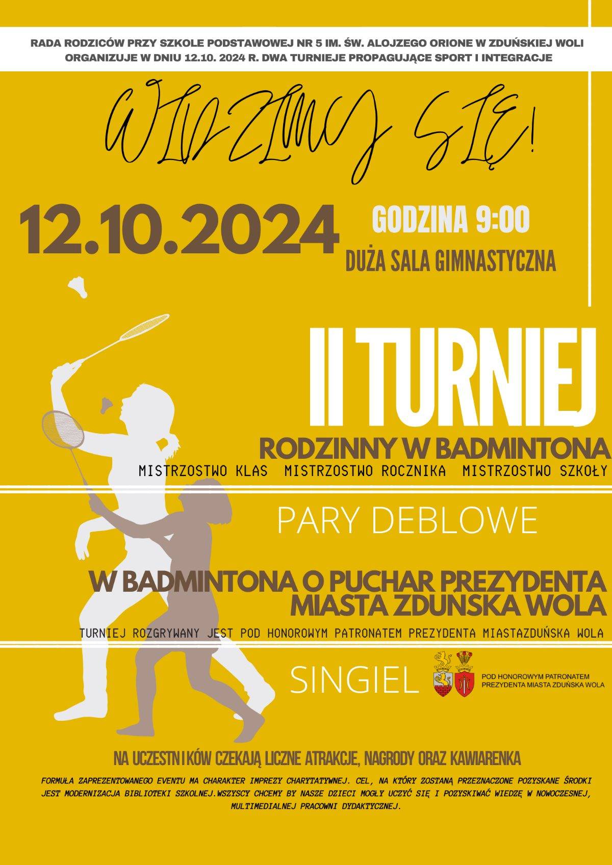 II Turniej Badmintona o Puchar Prezydenta Miasta Zduńska Wola oraz II Turniej Rodzinny w Badmintona – formuła deblowa organizuje Rada Rodziców przy Szkole Podstawowej nr 5 im. św. Alojzego Orione w Zduńskiej Woli. Turniej odbędzie się w sobotę, 12 października. Początek o godz. 9.