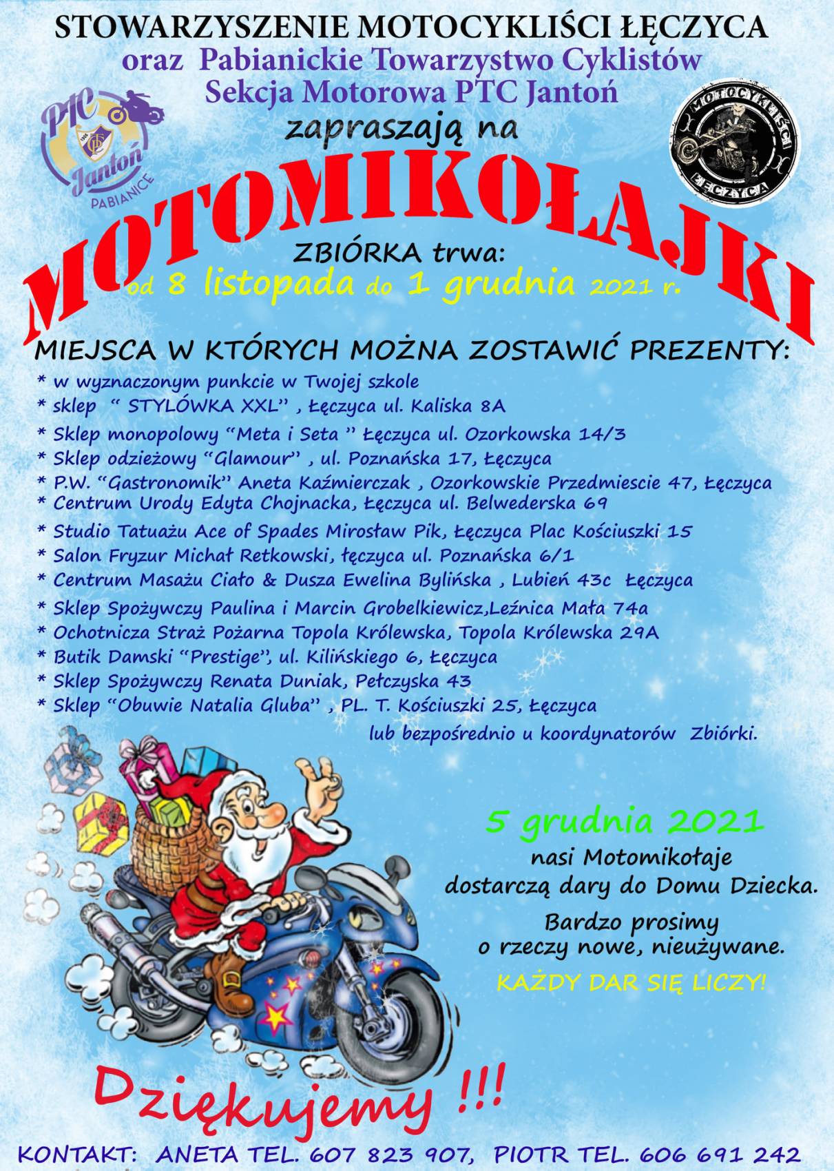 Cały czas trwa zbiórka darów w ramach kolejnej edycji akcji "Motomikołajki". W tym roku organizatorami są Stowarzyszenie Motocykliści Łęczyca oraz Pabianickie Towarzystwo Cyklistów Sekcja Motorowa PTC Jantoń.